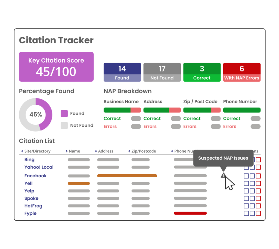 No more hours wasted on manual searches. Citation Tracker lets you check the accuracy of your listings across the web in a single click.
