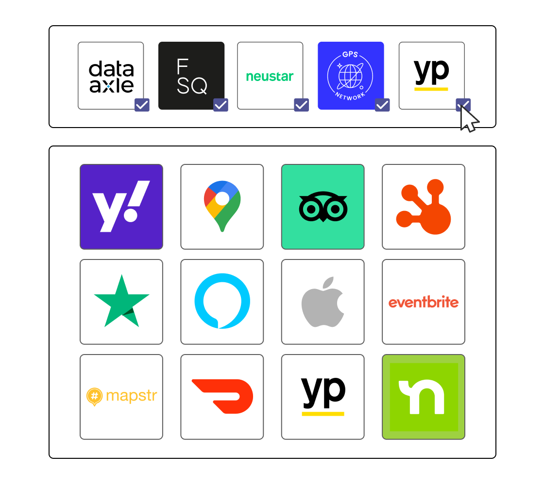 You have complete control to pick from any of the 1,000+ sites that we submit to. That said, we highly recommend you include the following power-players as part of your selection: Google My Business, Bing, Apple Maps, Facebook, Yelp, and YellowPages.