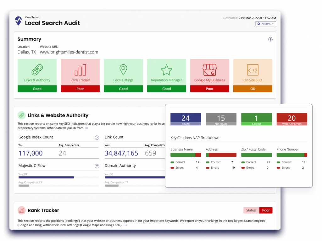 It looks at your rankings, reviews, business listings, on-page SEO, links, Google Business Profile and hundreds of other factors, then provides you with simple, actionable insights based on these data points. There are many local SEO ranking factors that you’ll want to be familiar with, and Local Search Audit allows you to understand all of them at a glance.