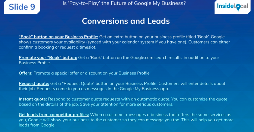 “I think getting leads from competitor profiles is very Yelp-like, and a slap in the face to small businesses. We can already do Offers through Google Posts. The Instant Quote is kind of weird. The only way I can see them doing this is by giving them all the information, but if you’re using your ‘Products and Services’ tabs in GMB, you’re already giving them a lot of information that they could work with to provide quotes. I think leads and conversion features are appealing to small business owners, but also somewhat appealing to agencies as it’s trackable, and helps them prove their value.”