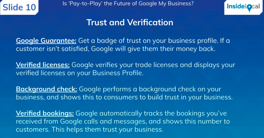 “We already have background checks in LSAs, and I believe they’re doing this in AdWords too. Verified licenses is something Yelp has just started doing, it’s quite easy for them, all they need to do is scrape the state or city databases for verified licences. Verified bookings would be quite hard for GMB to deal with unless it was through the ‘Book’ button. I think these are good for Google, small businesses, and consumers, because they help weed out suspect businesses that scare everybody.”