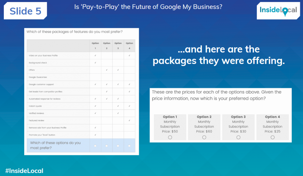 Myles hypothesized that for SERP placement, any paid-for pack from Google would have to be in a bidding format, rather than the bundles proposed in the survey. He then asked how paid-for elements could limit GMB spam, which the panel had strong opinions on.
